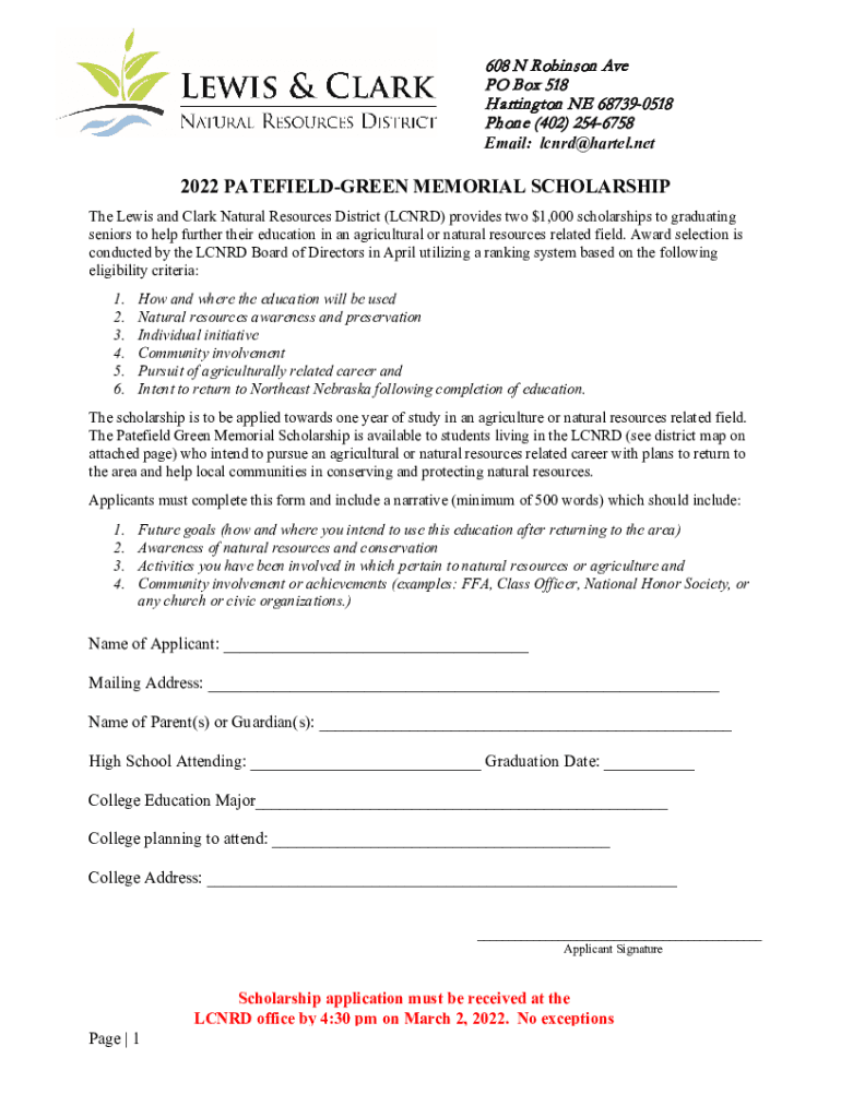 608 N Robinson Ave PO Box 518 H Arlington NE 687390518 Phone (402) 2546758 Email: lcnrd@hartel.net2022 PATEFIELDGREEN MEMORIAL SCHOLARSHIP The Lewis and Clark Natural Resources District (LCN RD) provides