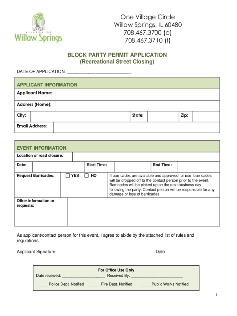 One Village Circle Willow Springs, IL 60480 708.467.3700 (o) 708.467.3710 (f) BLOCK PARTY PERMIT APPLICATION (Recreational Street Closing) DATE OF APPLICATION: ___APPLICANT INFORMATION Applicant Name: