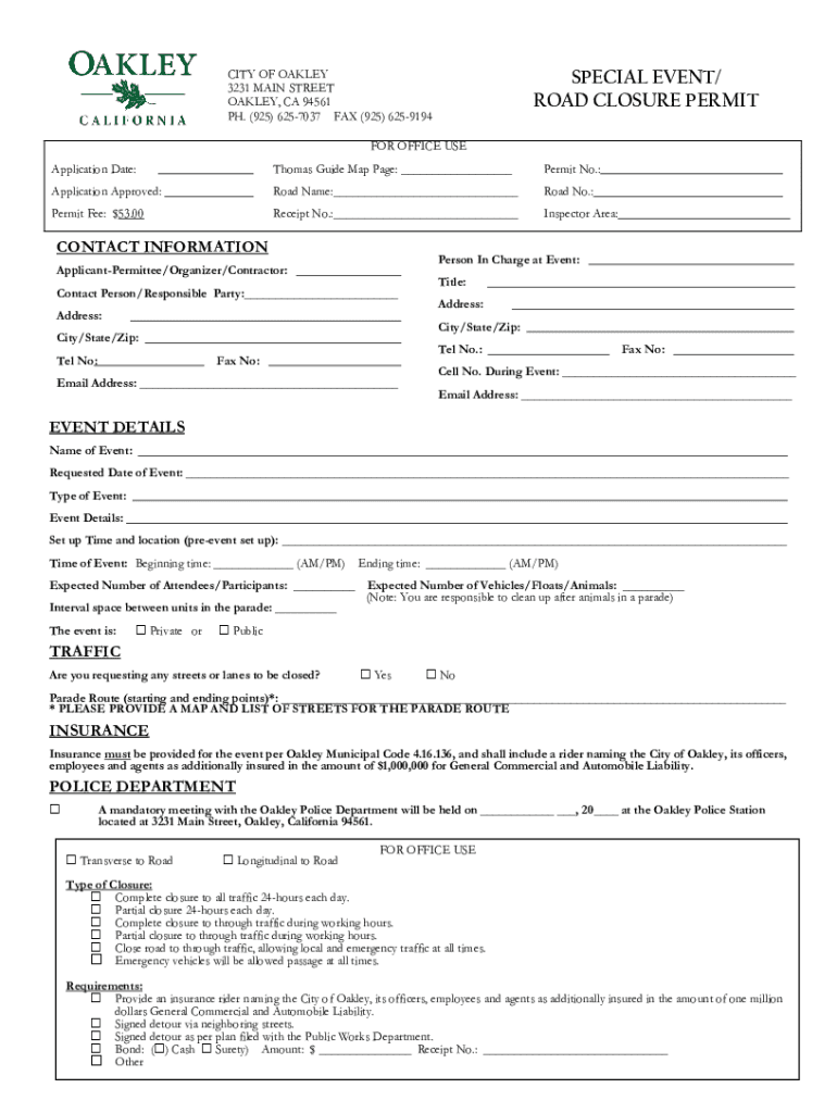 CITY OF OAKLEY 3231 MAIN STREET OAKLEY, CA 94561 PH. (925) 6257037 FAX (925) 6259194SPECIAL EVENT/ ROAD CLOSURE PERMIT OFFICE USE Application Date:Thomas Guide Map Page: ___Permit No.:Application