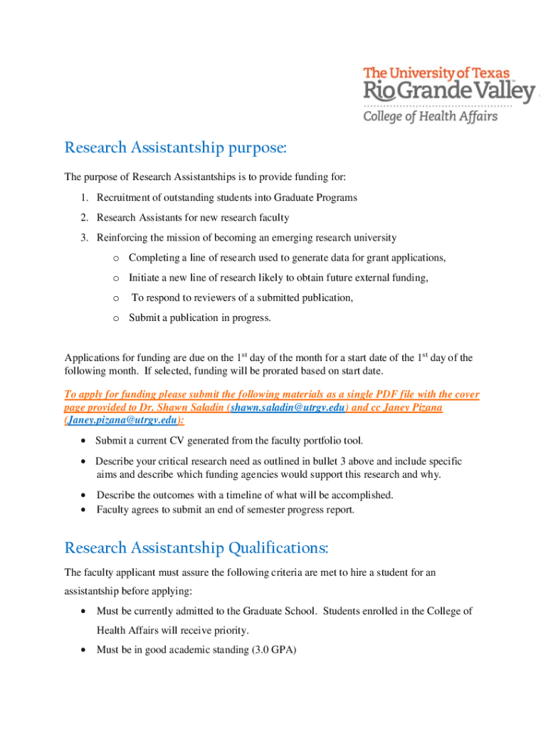 Research Assistant ship purpose: The purpose of Research Assistant ships is to provide funding for: 1. Recruitment of outstanding students into Graduate Programs 2. Research Assistants for new research
