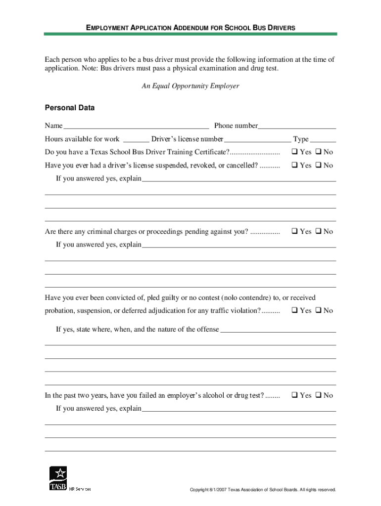 Bus driver applicants are required to file the filesgabbartcom2056busdriveraddendumsample employment application addendum.
