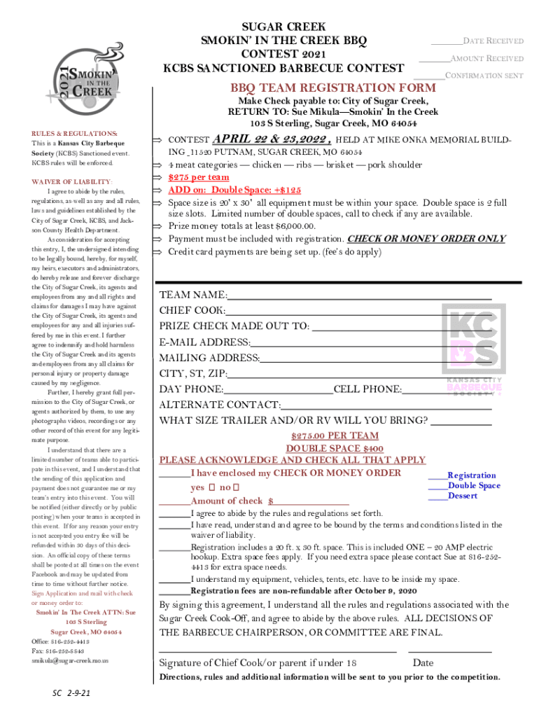 SUGAR CREEK SMOKING IN THE CREEK BBQ CONTEST 2021 KBS SANCTIONED BARBECUE CONCENTRATE RECEIVED AMOUNT RECEIVED CONFIRMATION SENT BBQ TEAM REGISTRATION FORM Make Check payable to: City of Sugar Creek,