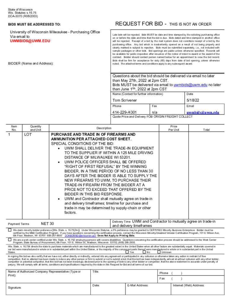 State of Wisconsin Wis. Statutes s.16.75 DOA3070 (R08/2003)REQUEST FOR BID BIDS MUST BE ADDRESSED TO:University of Wisconsin Milwaukee Purchasing Office Via email to UWMBIDS@UWM.EDUBIDDER (Name and
