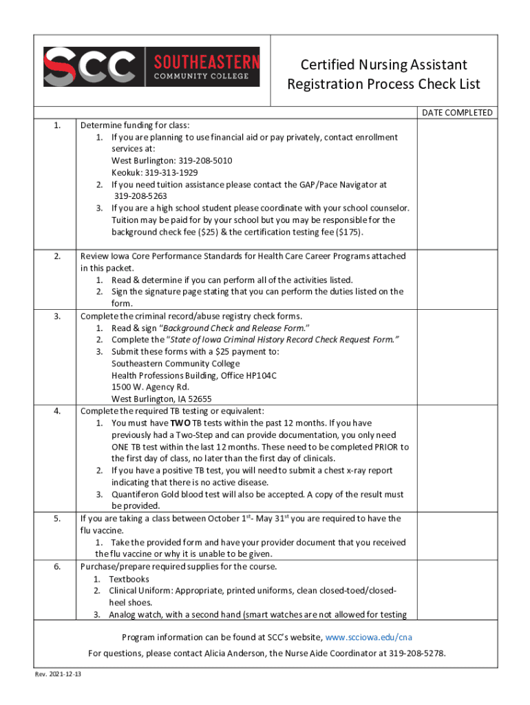 Certified Nursing Assistant Registration Process Check List 1. Determine funding for class: 1. If you are planning to use financial aid or pay privately, contact enrollment services at: West Burlington: