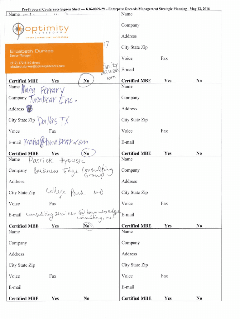 Proposal Conference Signing Sheet K16009929 Enterprise Records Management Strategic Planning May 12, 2016_1/inane_Name 1. Company m it DINFORMVISOSSRAddressI TRANSFORM OUTPERFORM7 Elizabeth Durfee
