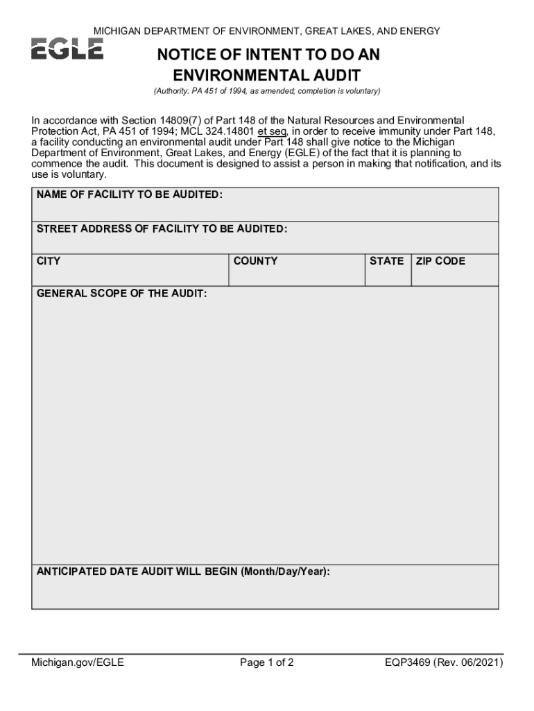 MICHIGAN DEPARTMENT OF ENVIRONMENT, GREAT LAKES, AND ENERGYNOTICE OF INTENT TO DO AN ENVIRONMENTAL AUDIT(Authority: PA 451 of 1994, as amended; completion is voluntary)In accordance with Section 14809(7)