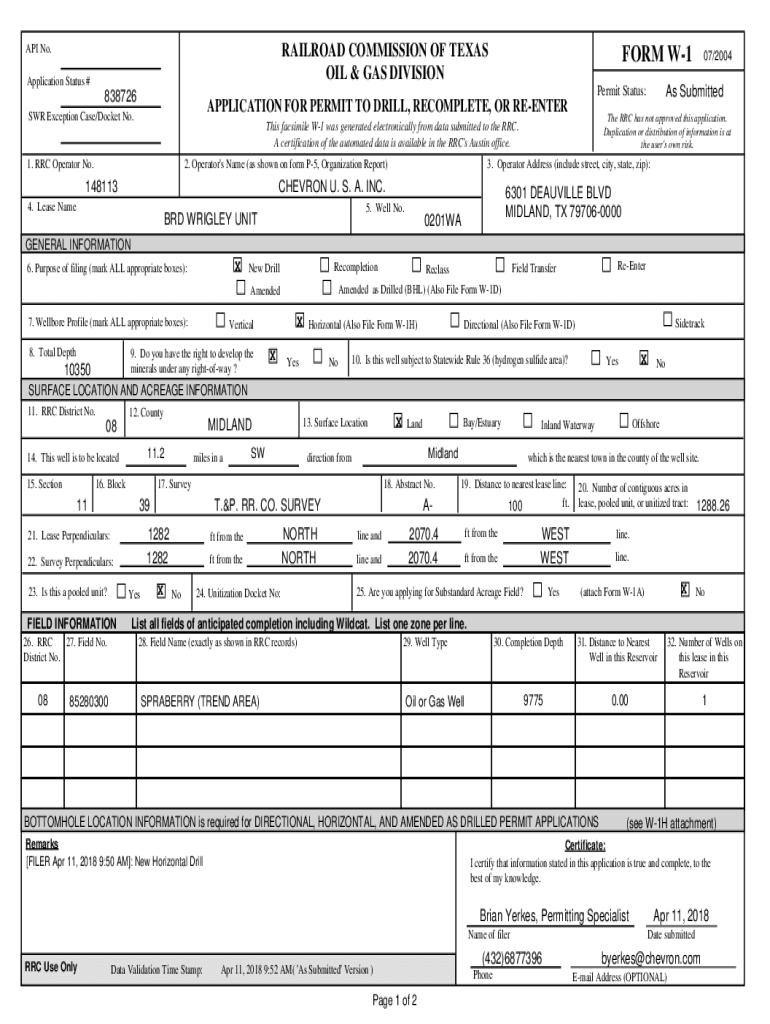 RAILROAD COMMISSION OF TEXAS OIL & GAS DIVISION API No. Application Status #FORM W1As SubmittedPermit Status:838726APPLICATION FOR PERMIT TO DRILL, COMPLETE, OR REENTER SWR Exception Case/Docket No.