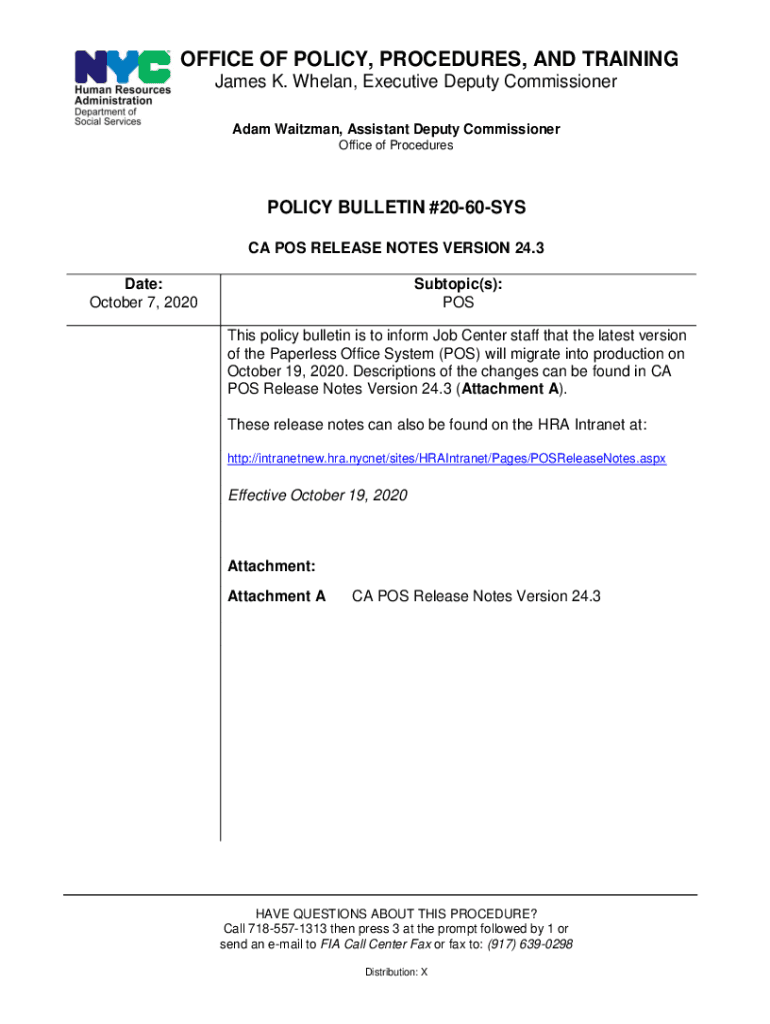 OFFICE OF POLICY, PROCEDURES, AND TRAINING James K. Wherein, Executive Deputy Commissioner Adam Whitman, Assistant Deputy Commissioner Office of ProceduresPOLICY BULLETIN #2060SYS CA POS RELEASE NOTES