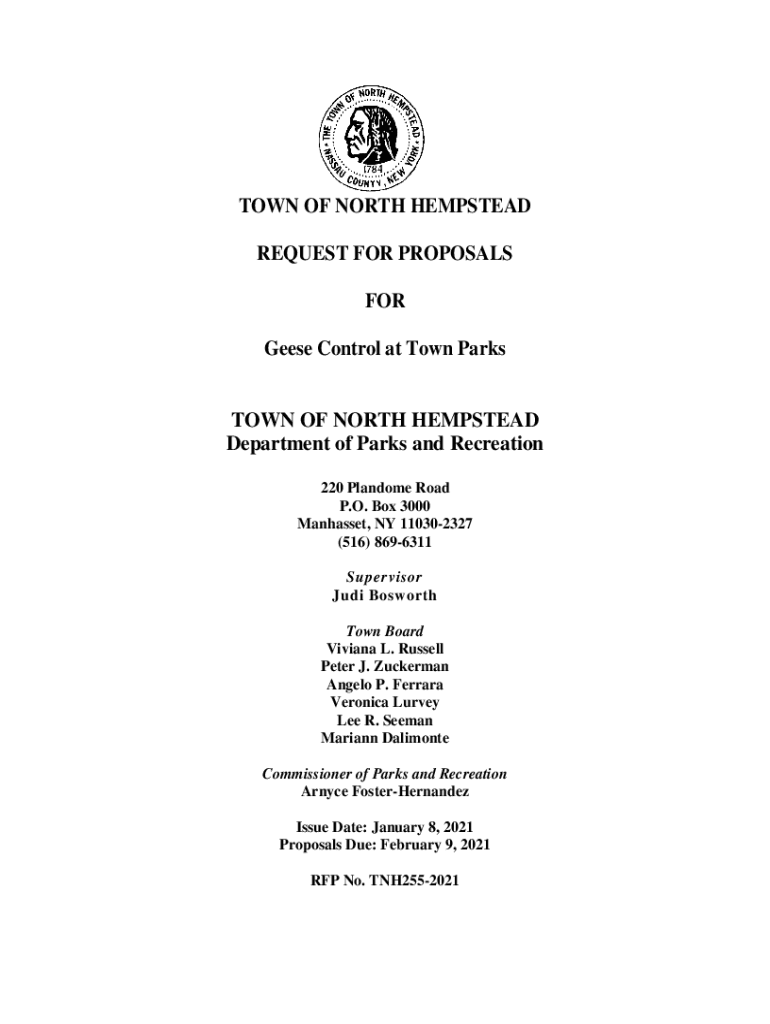 TOWN OF NORTH HEMPSTEAD REQUEST FOR PROPOSALS FOR Geese Control at Town Bankstown OF NORTH HEMPSTEAD Department of Parks and Recreation 220 Plan dome Road P.O. Box 3000 Manasseh, NY 110302327 (516)