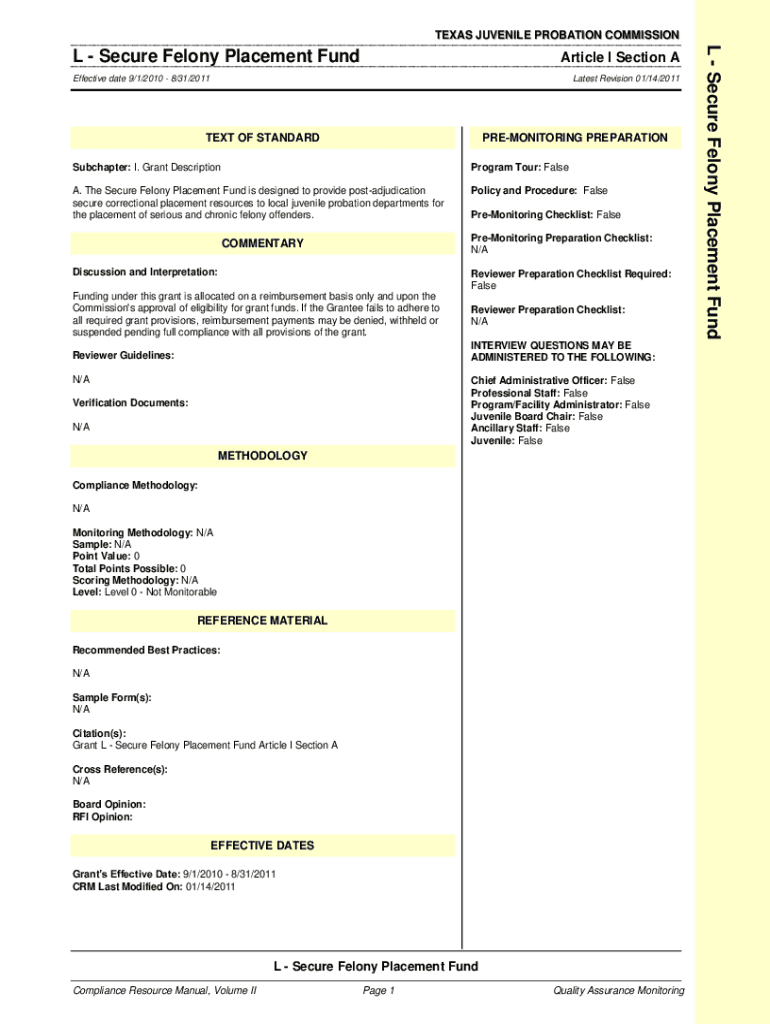 TEXAS JUVENILE PROBATION COMMISSIONArticle I Section Effective date 9/1/2010 8/31/2011Latest Revision 01/14/2011TEXT OF STANDARDPREMONITORING PREPARATIONSubchapter: I. Grant DescriptionProgram Tour: