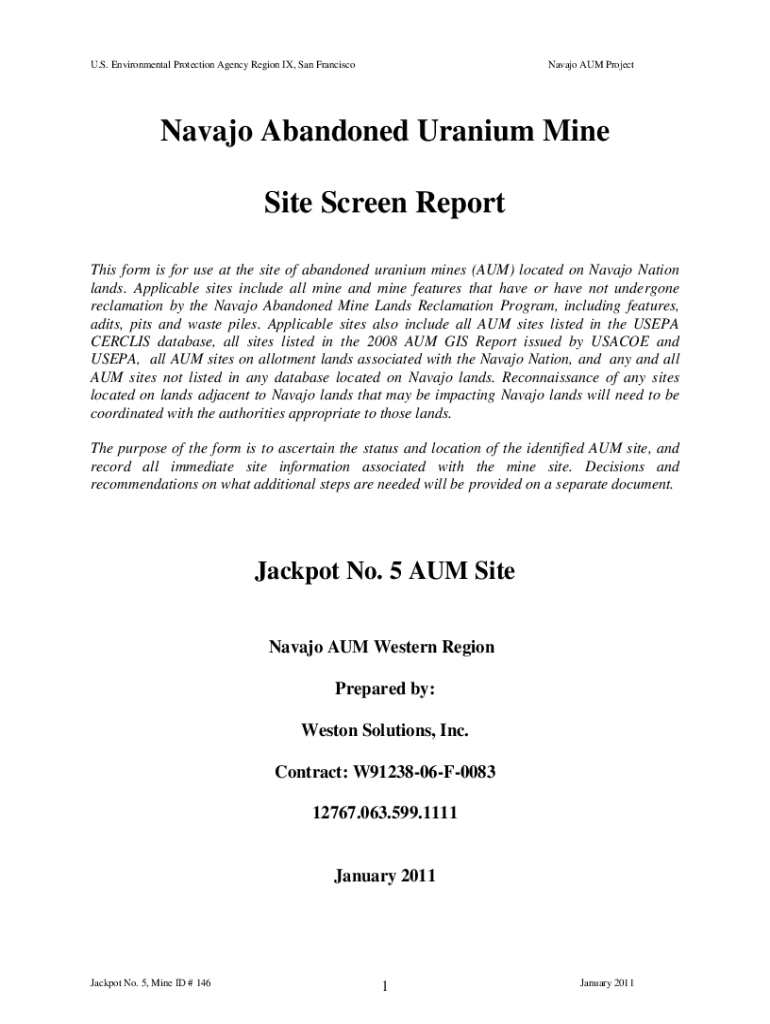 U.S. Environmental Protection Agency Region IX, San Francisco Navajo AUM Project Navajo Abandoned Uranium Mine Site Screen Report This form is for use at the site of abandoned uranium mines (AUM)