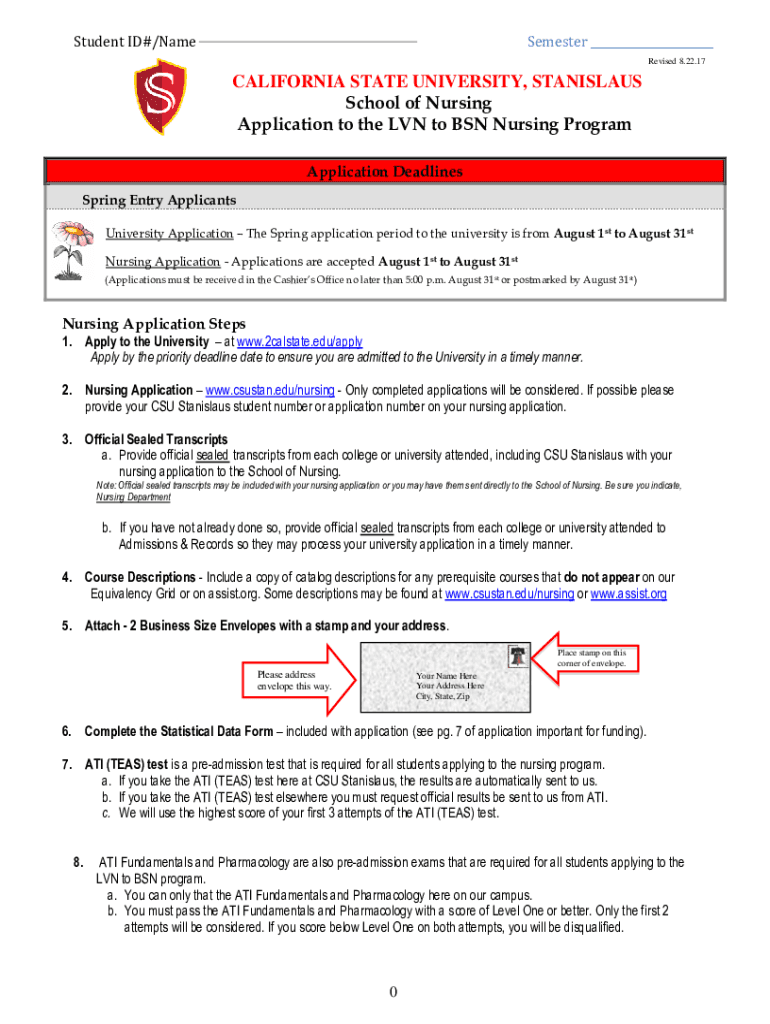 Student ID#/NameSemester ___ Revised 8.22.17CALIFORNIA STATE UNIVERSITY, STANISLAUS School of Nursing Application to the LVN to BSN Nursing Program Application Deadlines Spring Entry Applicants University