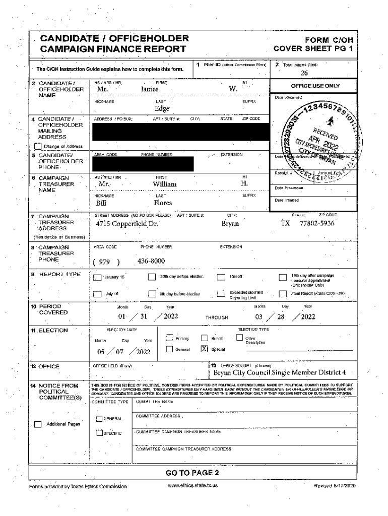 CANDIDATE / OFFICEHOLDER CAMPAIGN FINANCE REPORT Filer ID(1Ethics Commissioners)2SHEETMr.OFFICEHOLDERJames26 OFFICE USE ONLY.NAMED ate. Received\'SUFFIXLASTNICKNAME2.2,456Edge ADDRESS /CANDIDATE/4PO