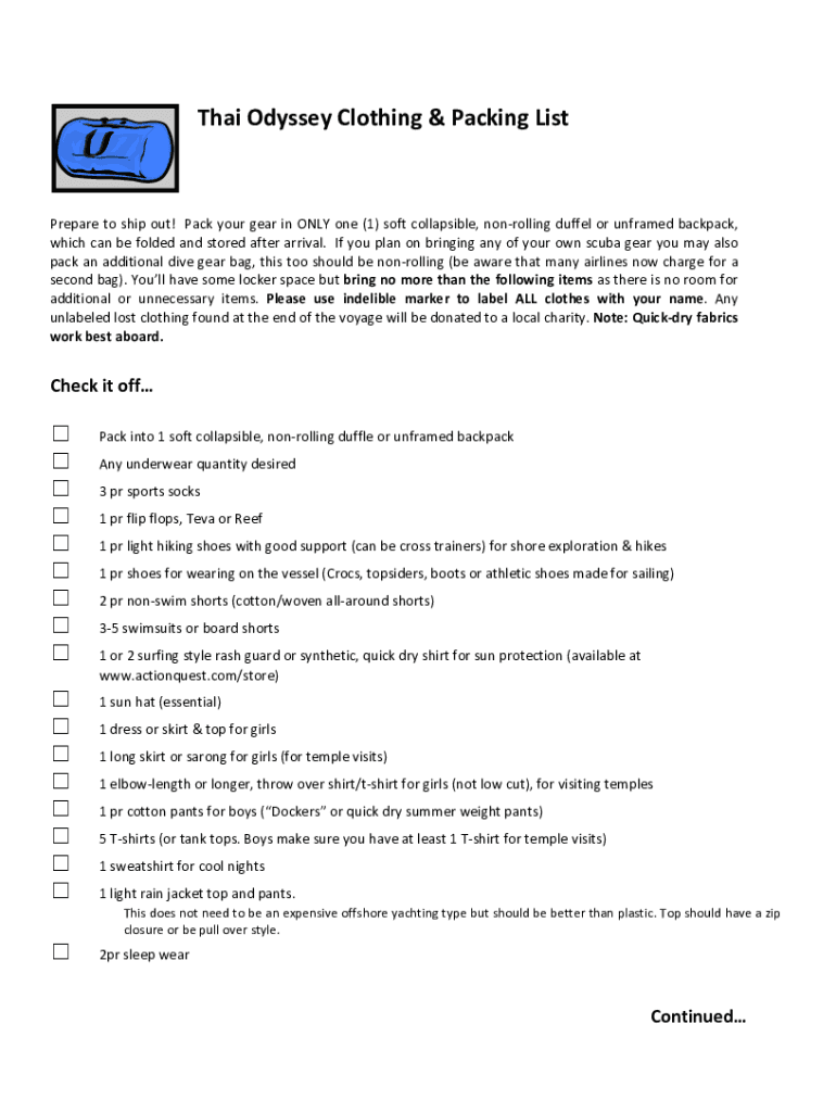 ThaiOdysseyClothing&PackingListPreparetoshipout! PackyourgearinONLYone(1)soft collapsible, nonrollingduffelorunframedbackpack, whichcanbefoldedandstoredafterarrival. Ifyouplanonbringinganyofyourownscubagearyoumayalso