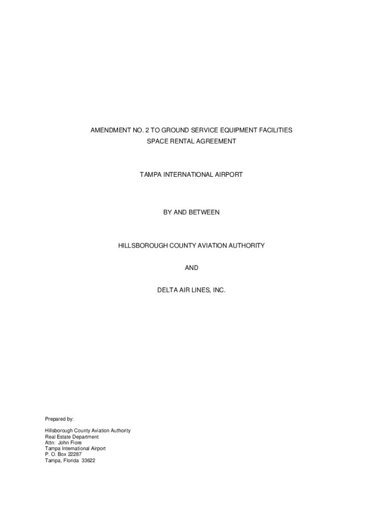 AMENDMENT NO. 2 TO GROUND SERVICE EQUIPMENT FACILITIES SPACE RENTAL AGREEMENTTAMPA INTERNATIONAL AIRPORT AND BETWEENHILLSBOROUGH COUNTY AVIATION AUTHORITYANDDELTA AIR LINES, INC. Prepared by: Hillsborough