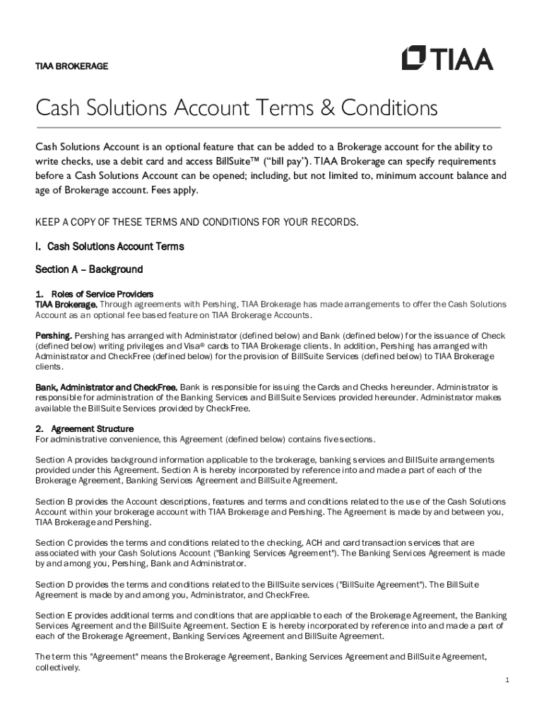 TIAA BROKERAGE Cash Solutions Account Terms & Conditions Cash Solutions Account is an optional feature that can be added to a Brokerage account for the ability to write checks, use a debit card and