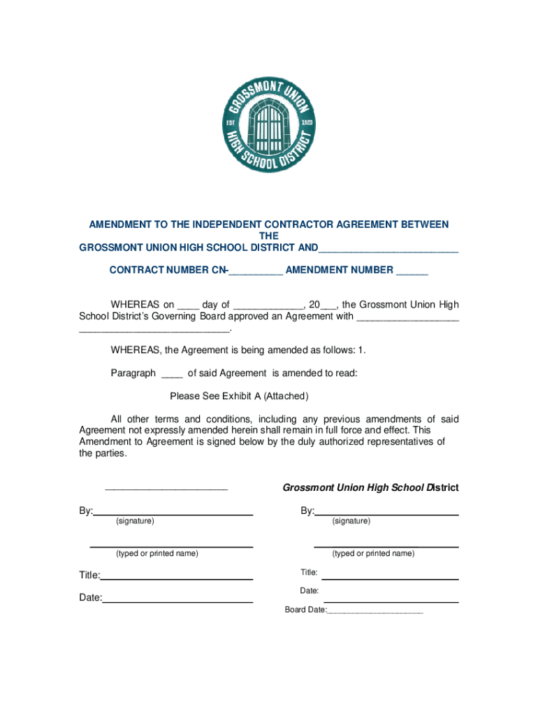 AMENDMENT TO THE INDEPENDENT CONTRACTOR AGREEMENT BETWEEN THE GROSSMAN UNION HIGH SCHOOL DISTRICT AND___ CONTRACT NUMBER CN___ AMENDMENT NUMBER ___WHEREAS on ___ day of ___, 20___, the Grossman Union