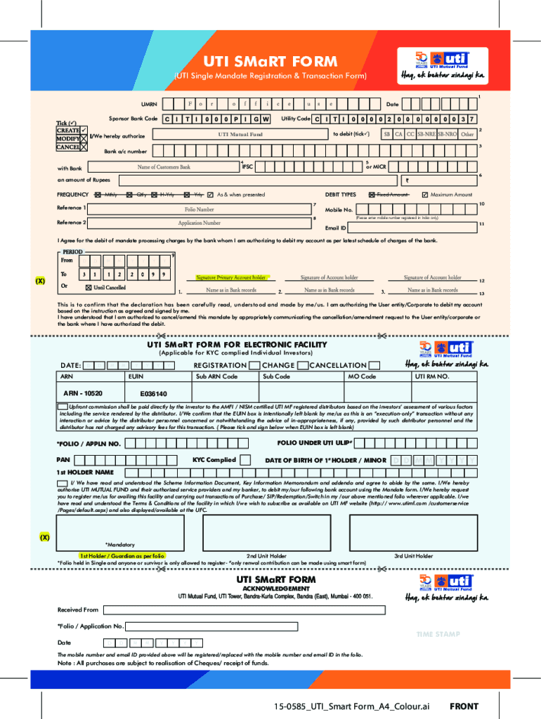 UTI Smart FORM (UTI Single Mandate Registration & Transaction Form)Saturn Sponsor Bank CodeCITI00 0PIG Utility Code CI T I0 00 0 0 0 0 3 7to debit (tick)UTI Mutual Funds/We hereby authorize0 0 0 0