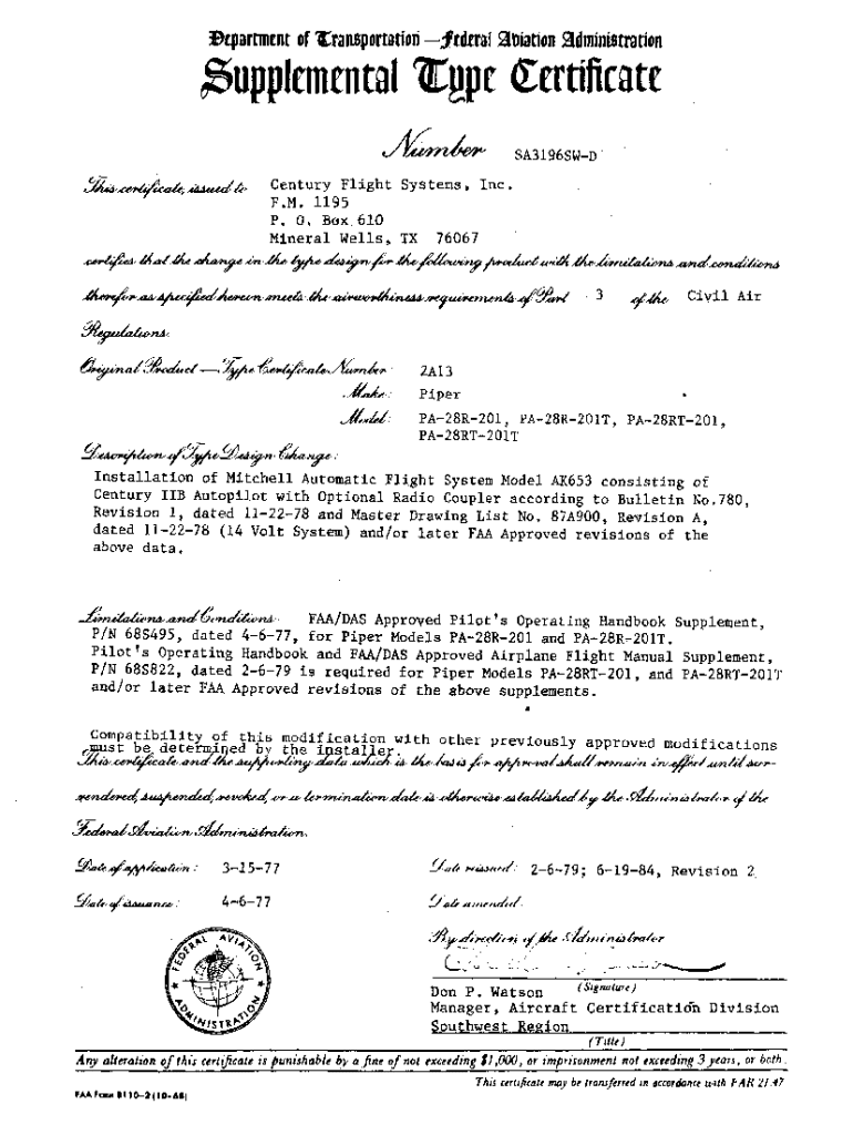 Department of transportation federal 2toiation administrationSupplemental type Certificate yKu4rw411\'SA3196SWDCentury Flight Systems, Inc. F.M. 1195 P. 0. Box 610 Mineral Wells, TX 76067.jA4.a4rtvcfr^3Civil