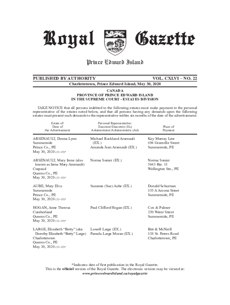 Prince Edward Island PUBLISHED BY AUTHORITY. CLVI NO. 22Charlottetown, Prince Edward Island, May 30, 2020, CANADA PROVINCE OF PRINCE EDWARD ISLAND IN THE SUPREME COURT ESTATES DIVISION TAKE NOTICE