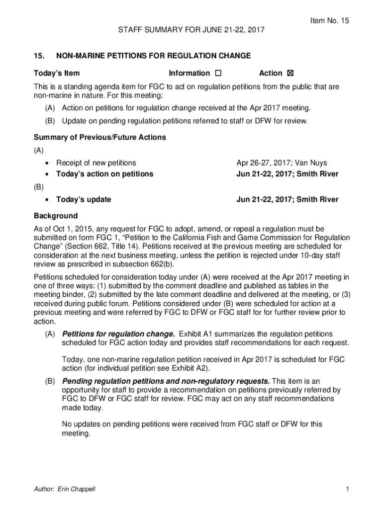 Item No. 15 STAFF SUMMARY FOR JUNE 2122, 2017 15.MARINE PETITIONS FOR REGULATION CHANGETodays ItemInformation Action This is a standing agenda item for FGC to act on regulation petitions from the
