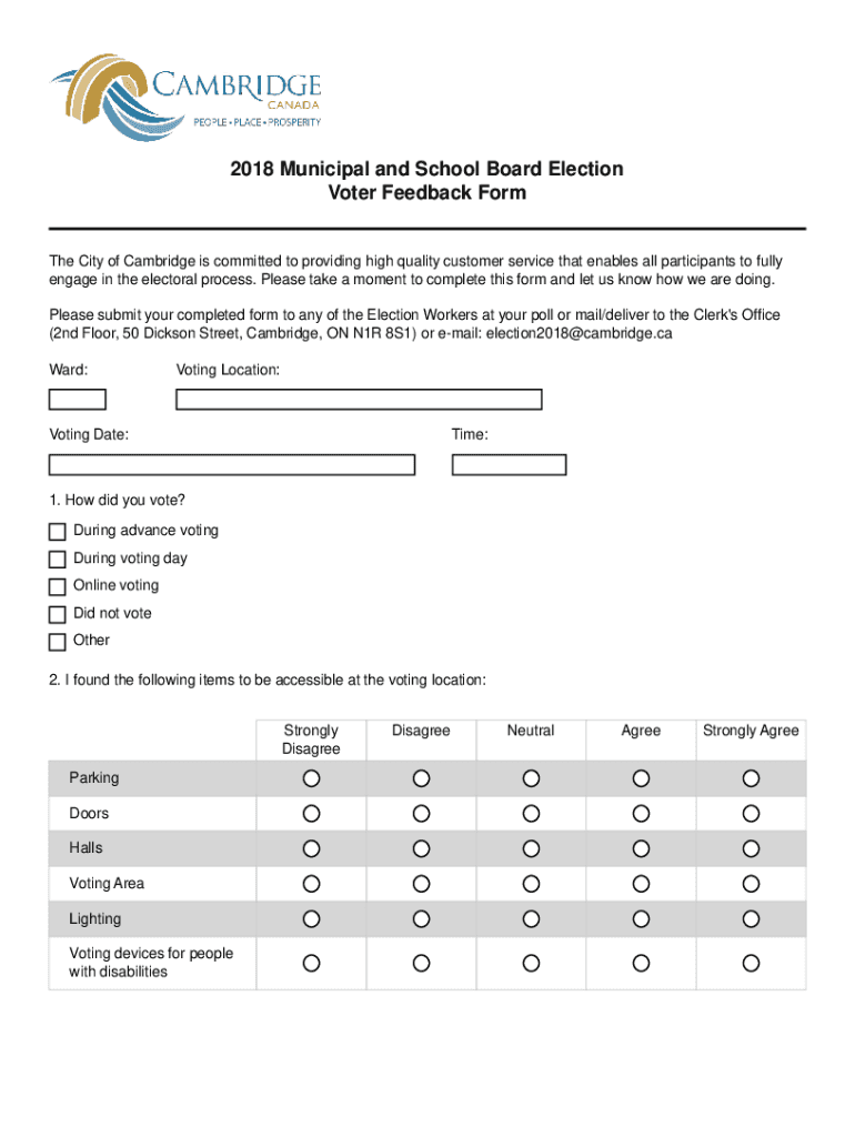 2018 Municipal and School Board Election Voter Feedback Forth City of Cambridge is committed to providing high quality customer service that enables all participants to fully engage in the electoral