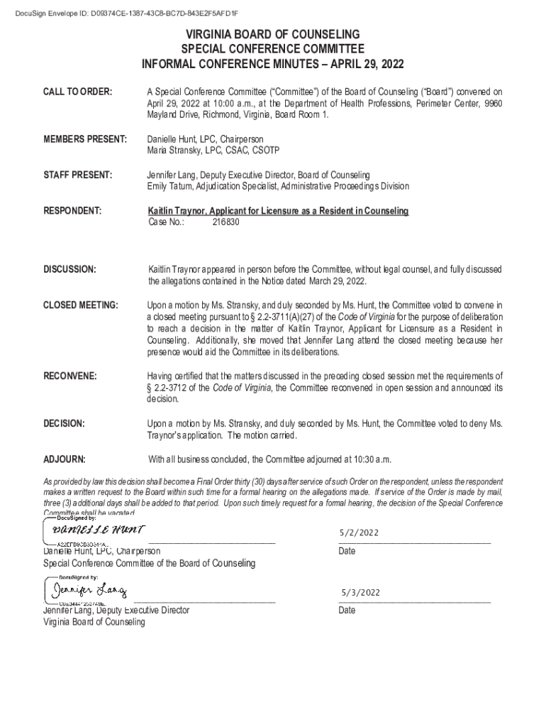 VIRGINIA BOARD OF COUNSELING SPECIAL CONFERENCE COMMITTEE INFORMAL CONFERENCE MINUTES APRIL 29, 2022, CALL TO ORDER:A Special Conference Committee (Committee) of the Board of Counseling (Board) convened