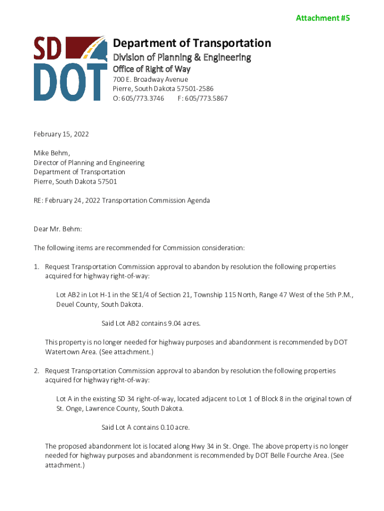 Attachment #5Department of Transportation Division of Planning & Engineering Office of Right of Way700 E. Broadway Avenue Pierre, South Dakota 575012586 O: 605/773.3746 F: 605/773.5867February 15,