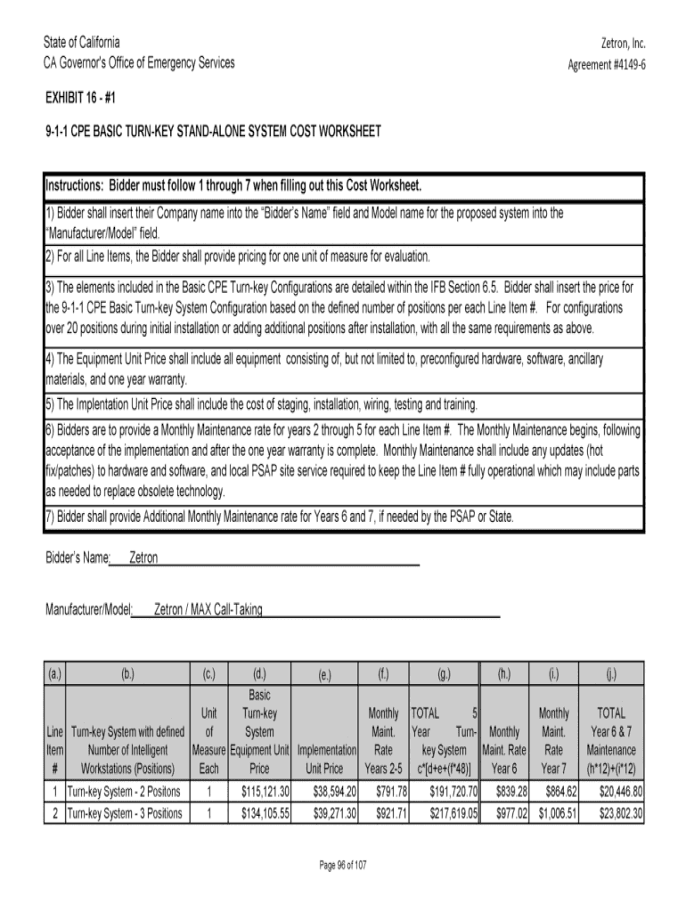 State of California CA Governor\'s Office of Emergency ServicesZetron, Inc. Agreement #41496EXHIBIT 16 #1 911 CPE BASIC TURNKEY STANDALONE SYSTEM COST WORKSHEETInstructions: Bidder must follow 1 through