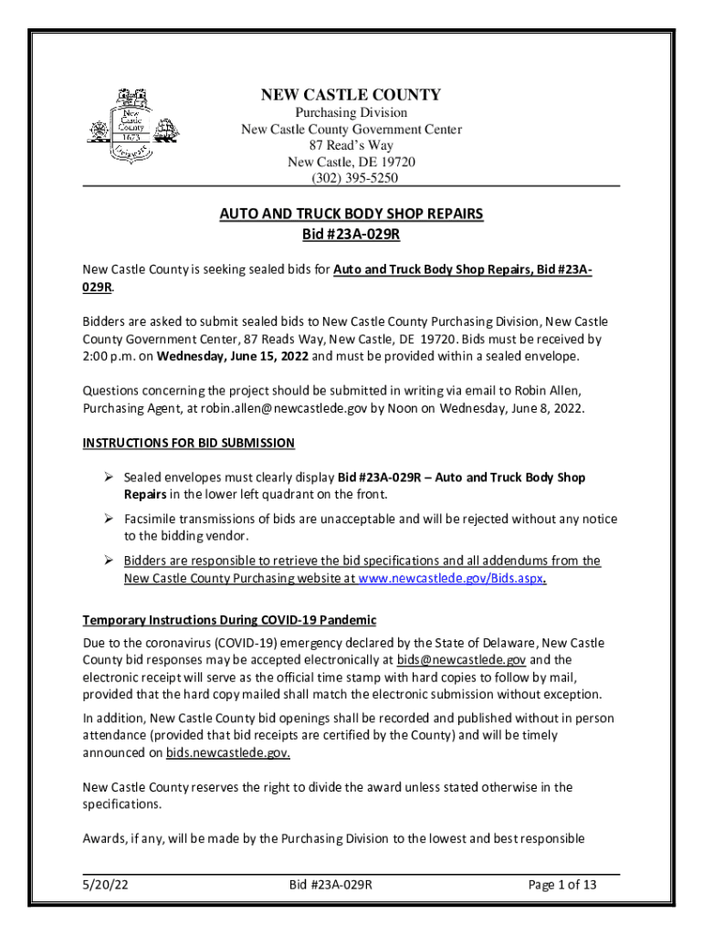 NEW CASTLE COUNTY Purchasing Division New Castle County Government Center 87 Reads Way New Castle, DE 19720 (302) 3955250AUTO AND TRUCK BODY SHOP REPAIRS Bid #23A029R New Castle County is seeking