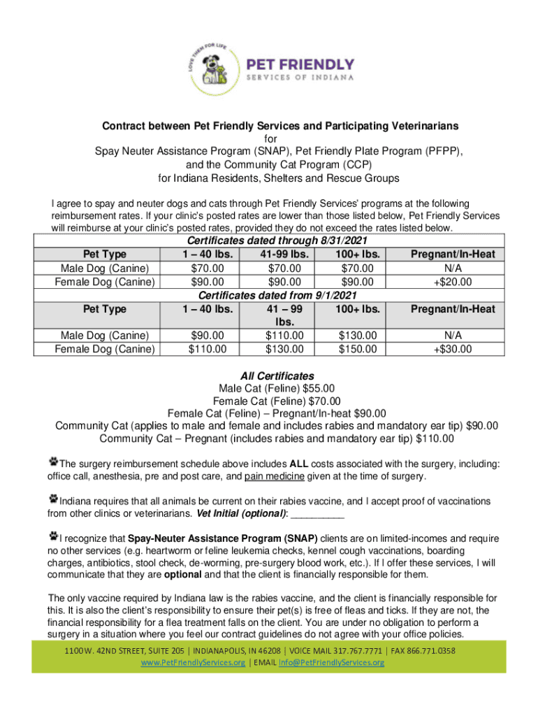 Contract between Pet Friendly Services and Participating Veterinarians for Spay Neuter Assistance Program (SNAP), Pet Friendly Plate Program (PPP), and the Community Cat Program (CCP) for Indiana