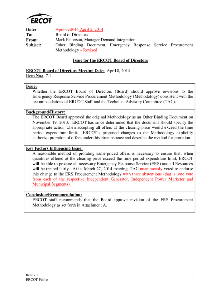 Date: To: From: Subject:April 1, 2014, April 2, 2014, Board of Directors Mark Patterson, Manager Demand Integration Other Binding Document, Emergency Response Service Procurement Methodology Revised