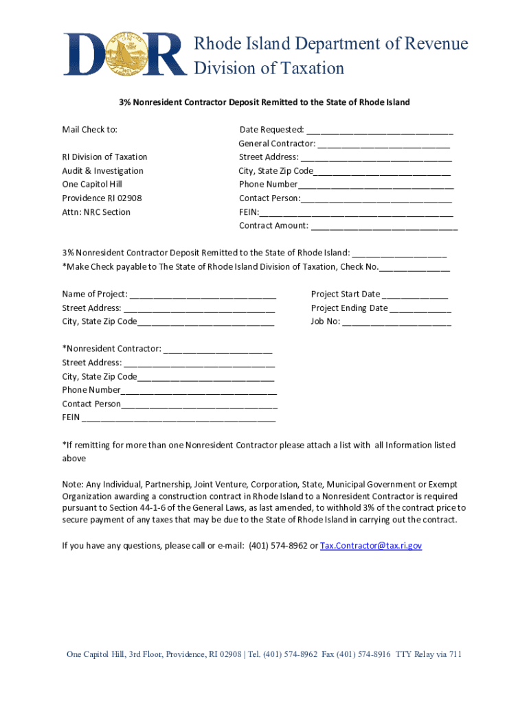 Rhode Island Department of Revenue Division of Taxation 3% Nonresident Contractor Deposit Remitted to the State of Rhode Island Mail Check to: RI Division of Taxation Audit & Investigation One Capitol