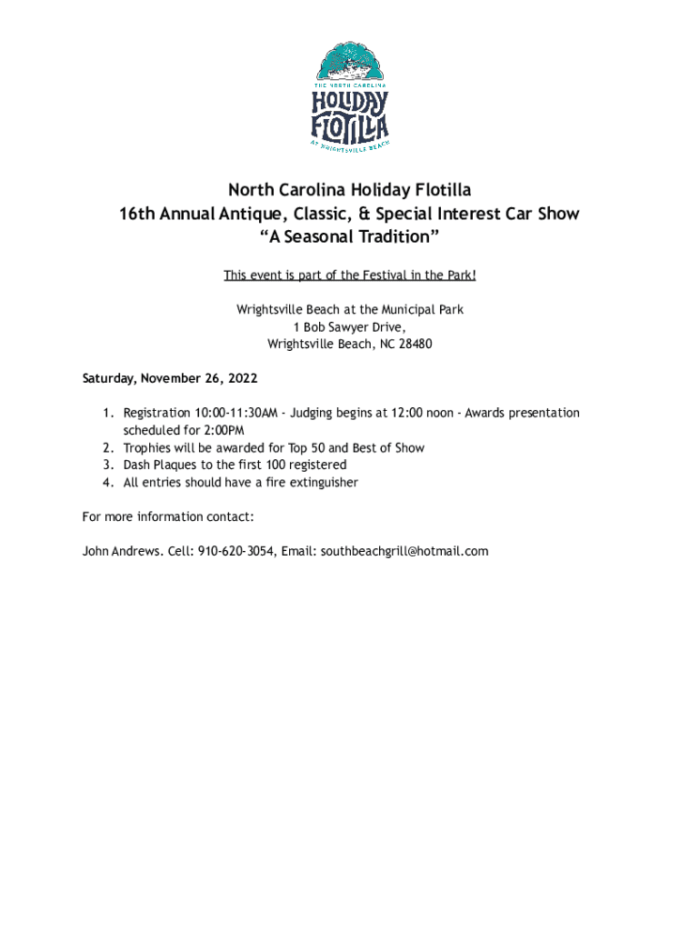 North Carolina Holiday Flotilla 16th Annual Antique, Classic, & Special Interest Car Show A Seasonal Tradition This event is part of the Festival in the Park! Wrightsville Beach at the Municipal Park