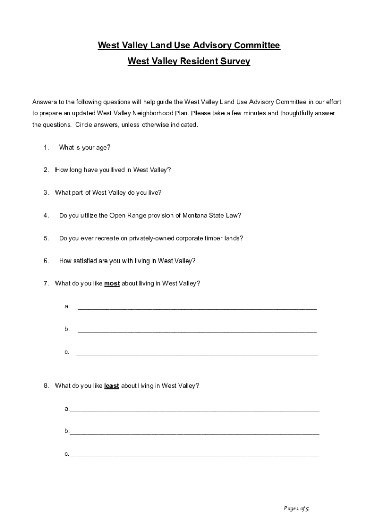 West Valley Land Use Advisory Committee West Valley Resident SurveyAnswers to the following questions will help guide the West Valley Land Use Advisory Committee in our effort to prepare an updated