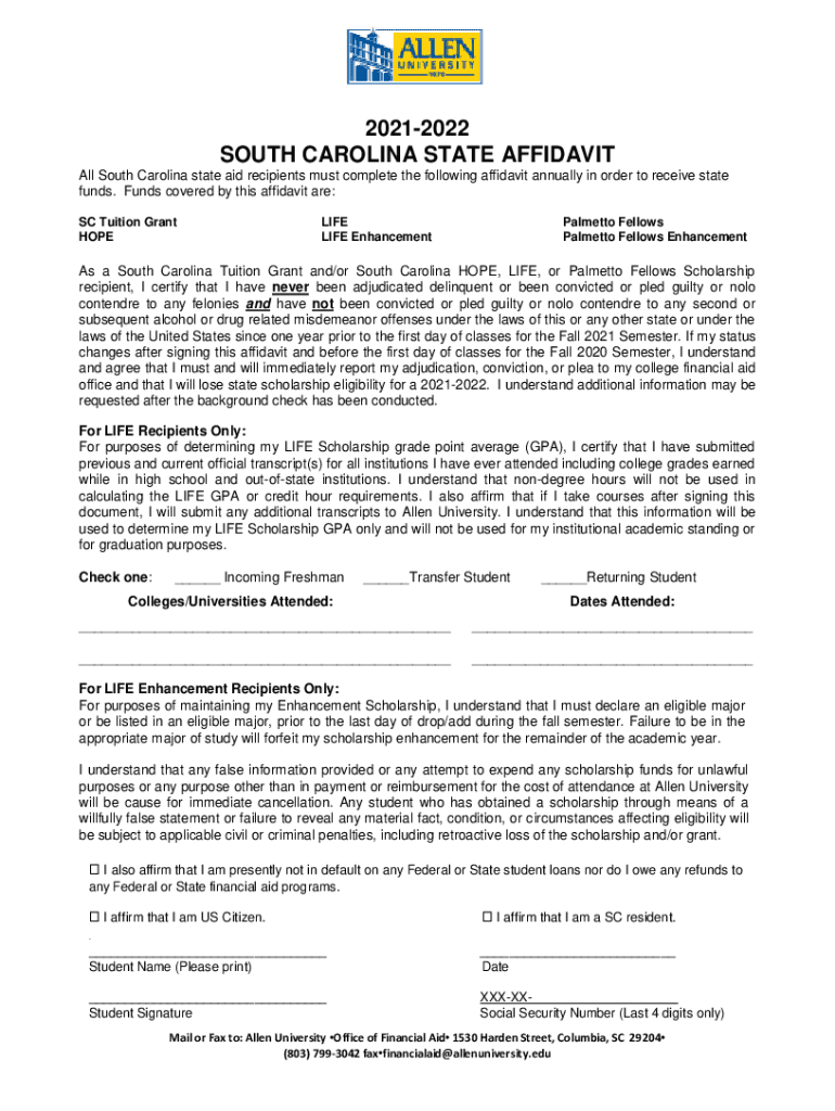 20212022 SOUTH CAROLINA STATE AFFIDAVIT All South Carolina state aid recipients must complete the following affidavit annually in order to receive state funds. Funds covered by this affidavit are: