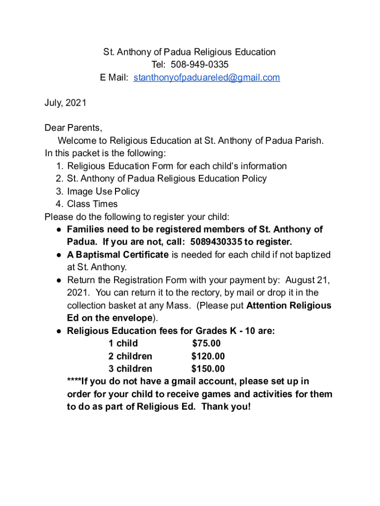 St. Anthony of Padua Religious Education Tel: 5089490335 E Mail: stanthonyofpaduareled@gmail.com July 2021 Dear Parents, Welcome to Religious Education at St. Anthony of Padua Parish. In this packet