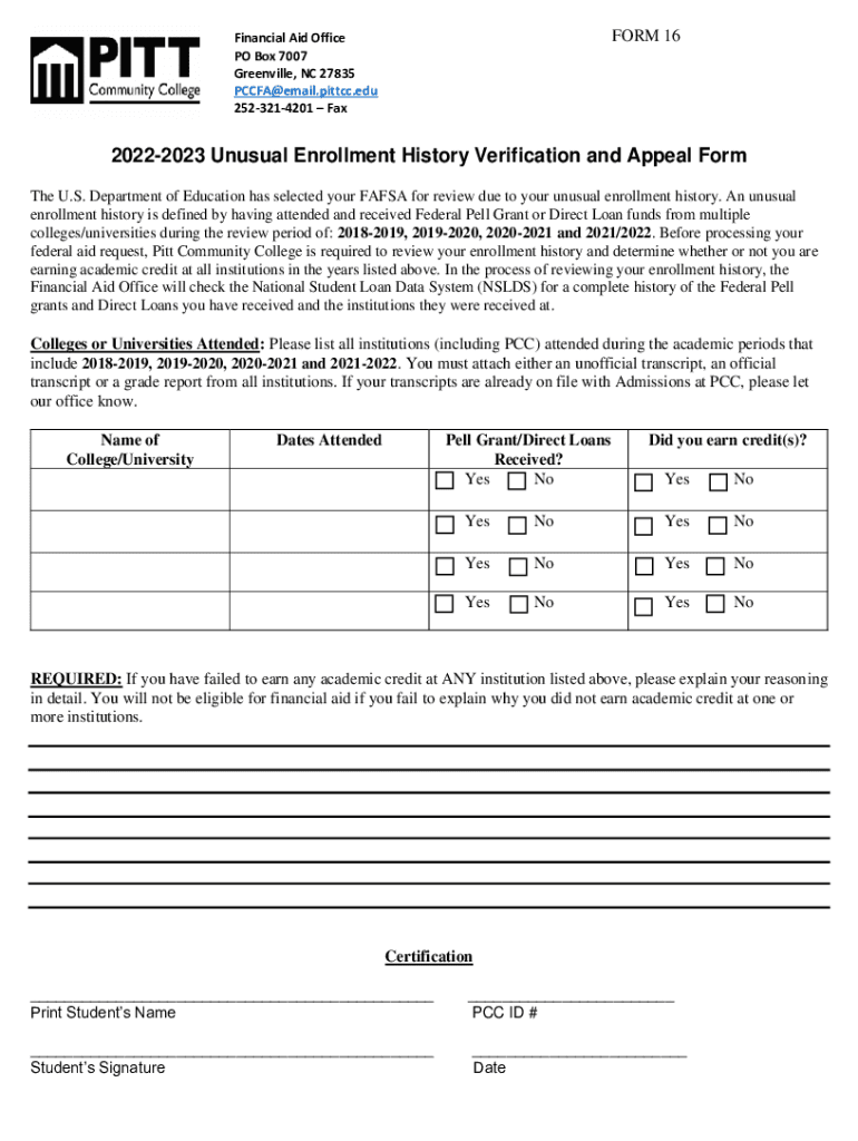 FORM 16Financial Aid Office PO Box 7007 Greenville, NC 27835 PCCFA@email.pittcc.edu 2523214201 Fax20222023 Unusual Enrollment History Verification and Appeal Form The U.S. Department of Education