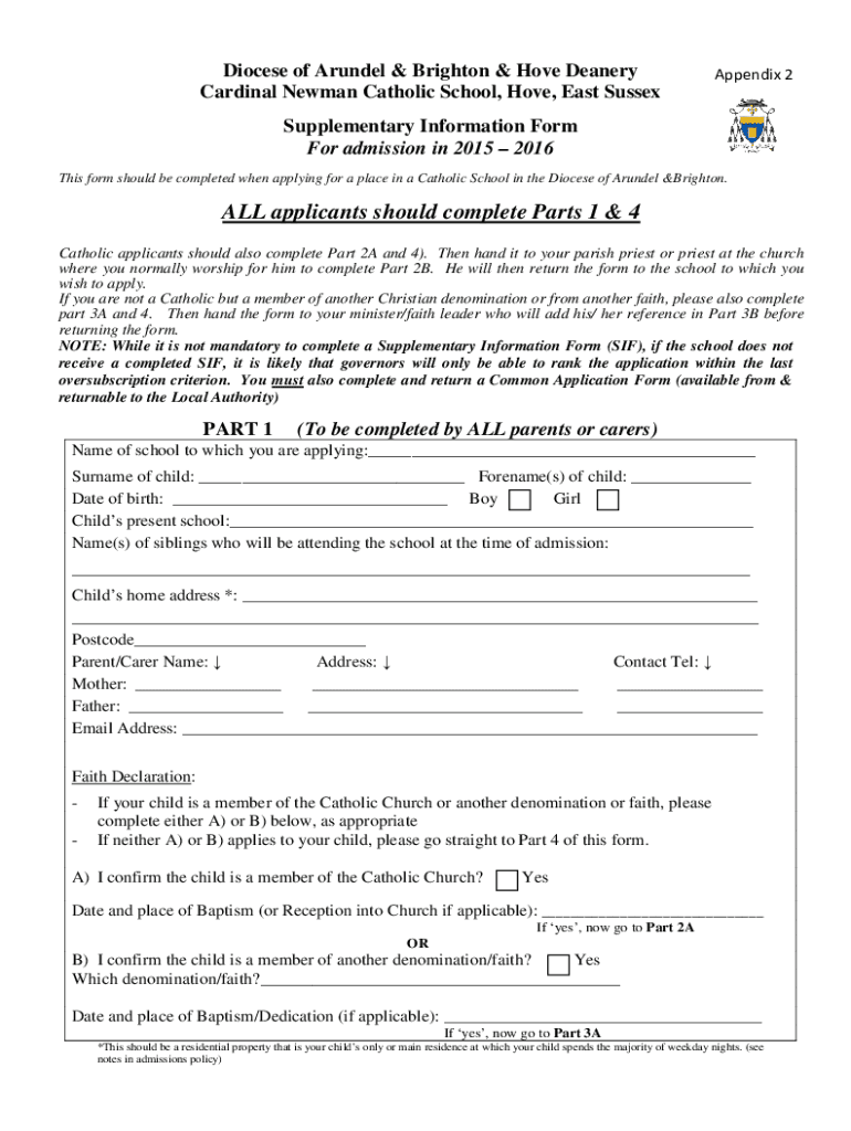 Diocese of Roundel & Brighton & Hove Deanery Cardinal Newman Catholic School, Hove, East SussexAppendix 2Supplementary Information Form For admission in 2015 2016 This form should be completed when