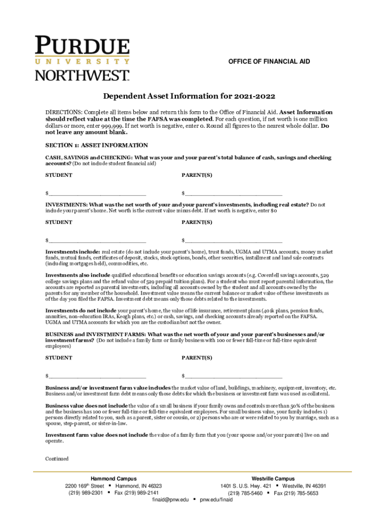 OFFICE OF FINANCIAL Independent Asset Information for 20212022 DIRECTIONS: Complete all items below and return this form to the Office of Financial Aid. Asset Information should reflect value at the