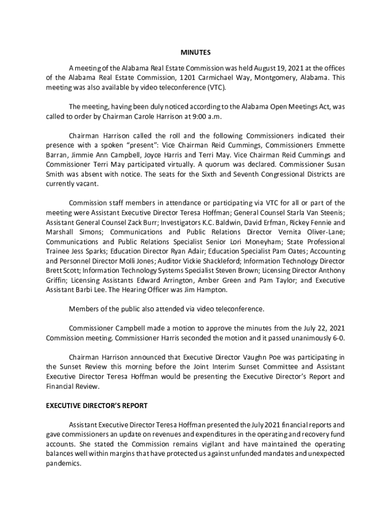 MINUTES A meeting of the Alabama Real Estate Commission was held August 19, 2021, at the offices of the Alabama Real Estate Commission, 1201 Carmichael Way, Montgomery, Alabama. This meeting was also