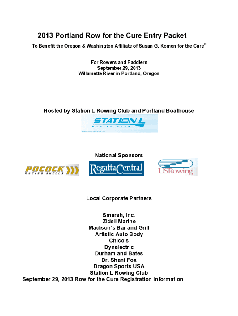2013 Portland Row for the Cure Entry Packet To Benefit the Oregon & Washington Affiliate of Susan G. Women for the Cure For Rowers and Paddlers September 29, 2013, Willamette River in Portland, OregonHosted