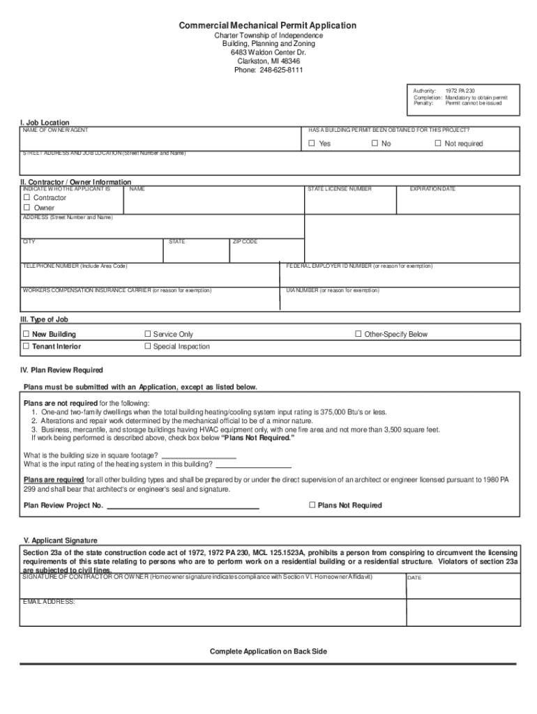Commercial Mechanical Permit Application Charter Township of Independence Building, Planning and Zoning 6483 Walton Center Dr. Clarkson, MI 48346 Phone: 2486258111 Authority: 1972 PA 230 Completion: