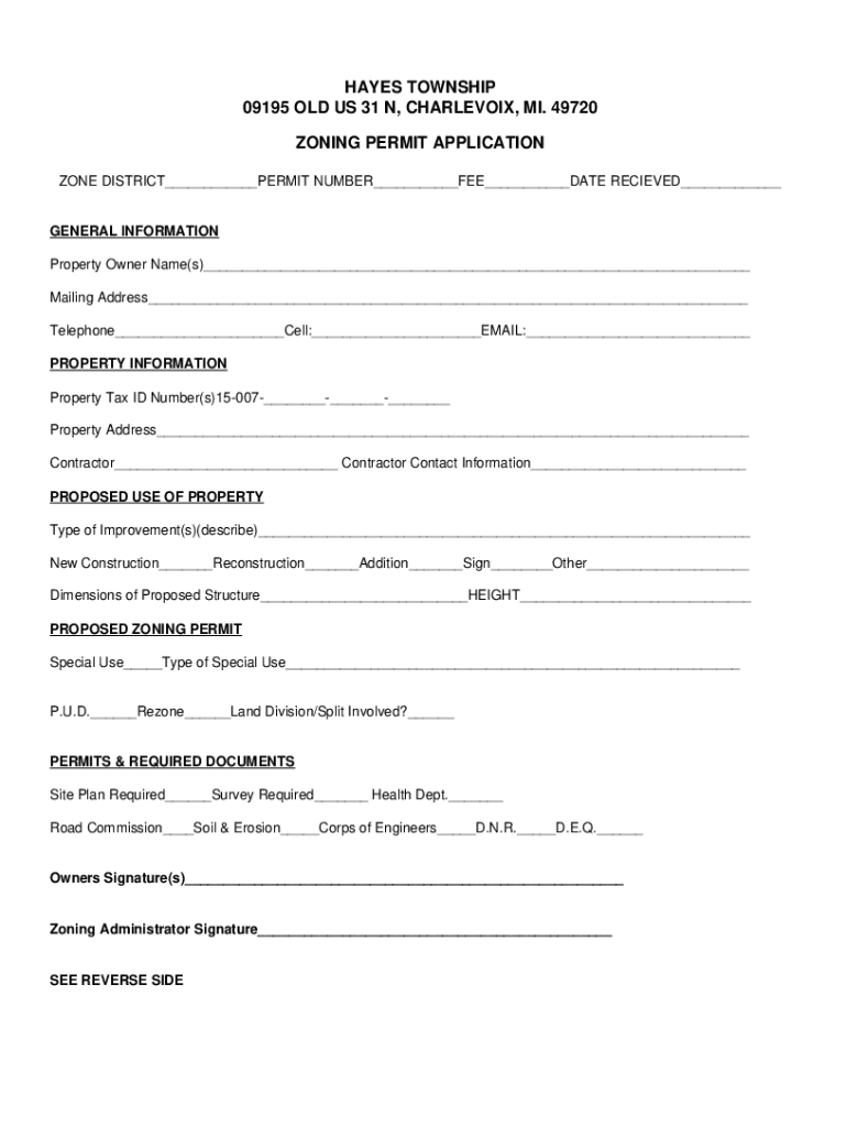 HAYES TOWNSHIP 09195 OLD US 31 N, CHARLEROI, MI. 49720 ZONING PERMIT APPLICATION ZONE DISTRICT___PERMIT NUMBER___FEE___DATE RECIEVED___GENERAL INFORMATION Property Owner Name(s)___ Mailing Address___