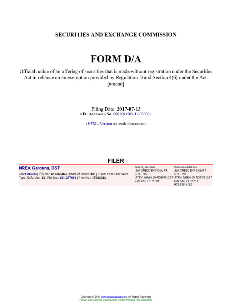 Get the free NREA Gardens, DST Form D/A Filed 2017-07-13. Accession Number