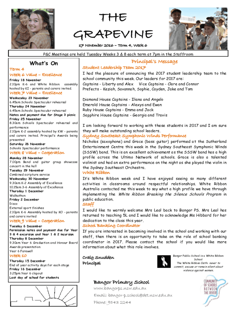 THE GRAPEVINE 17 November 2016 Term 4, Week 6 P&C Meetings are held Tuesday Weeks 3 & 8 each term at 7pm in the StaffroomWhats On Term 4 Week 6 Value Excellence Friday 18 November 2.10pm K6 and White
