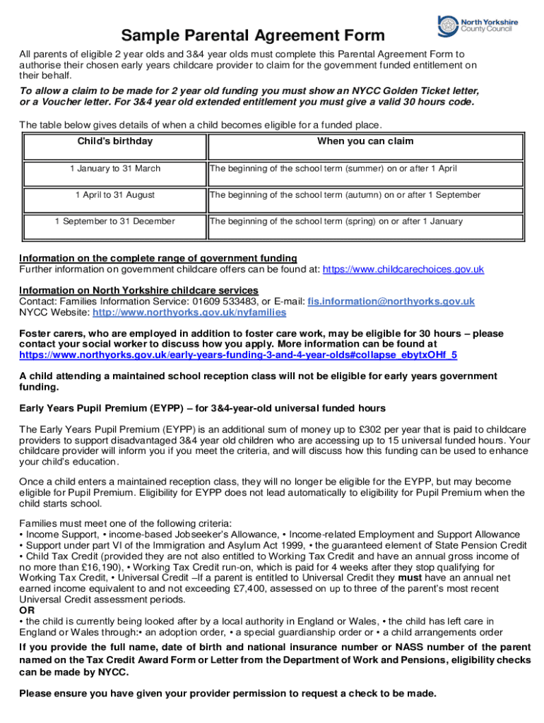 Sample Parental Agreement Form All parents of eligible 2-year-olds and 3&4 year olds must complete this Parental Agreement Form to authorize their chosen early years' childcare provider to claim for