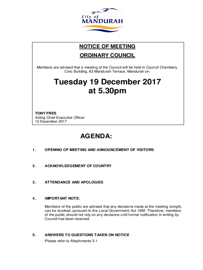 NOTICE OF MEETING ORDINARY COUNCIL Members are advised that a meeting of the Council will be held in Council Chambers, Civic Building, 83 Mandurah Terrace, Mandurah on:Tuesday 19 December 2017 at