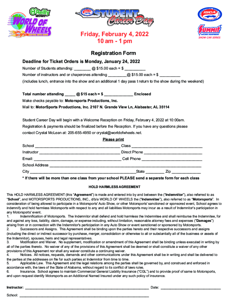 Friday, February 4, 2022 10 am 1 pm Registration Form Deadline for Ticket Orders is Monday, January 24, 2022, Number of Students attending: ___ @ $15.00 each $ ___ Number of instructors and or chaperones