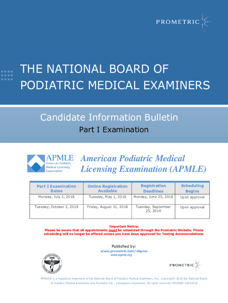 THE NATIONAL BOARD OF PEDIATRIC MEDICAL EXAMINERS Candidate Information Bulletin Part I Examination American Pediatric Medical Licensing Examination (APPLE) Part I Examination Dateline Registration